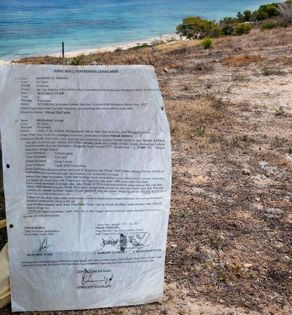 Surat yang dibuat di Labuan Bajo dan tertanggal 13 Desember 2021 itu menyebutkan penyerahan sebidang tanah adat seluas sekitar 15.000 meter persegi di Batu Gosok, Kelurahan Labuan Bajo, Kecamatan Komodo, Manggarai Barat.